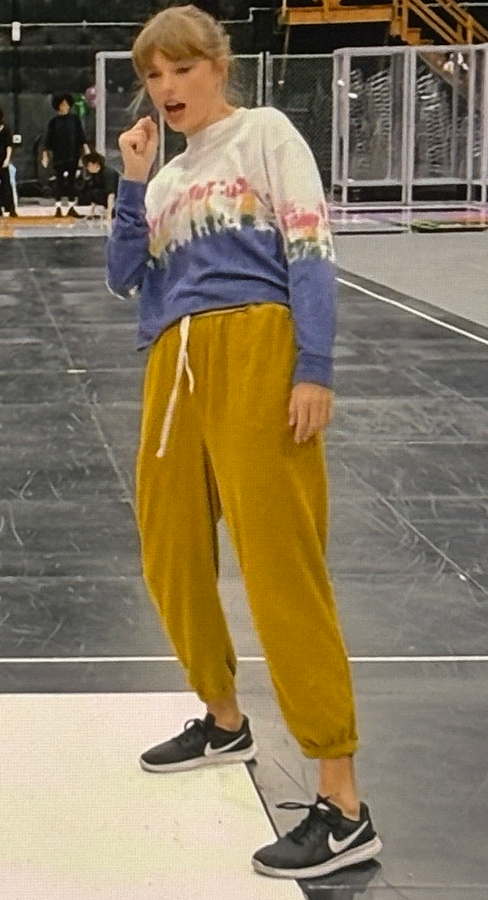 To that note, we saw a number of repeats throughout these behind-the-scenes looks, including this entire outfit of recognizable pieces! Taylor has owned these particular joggers since 2020 and the sweater since 2019.